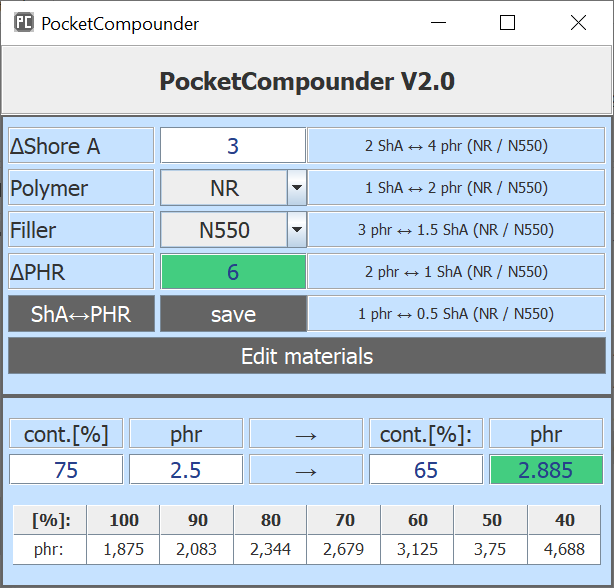 Calculation tool for filler (matrix NR or EPDM) and chemicals:- Create materials/fillers with the factors you use (ShA/phr). Afterwards, hardness increases/decreases or required phr quantities can be conveniently calculated.
